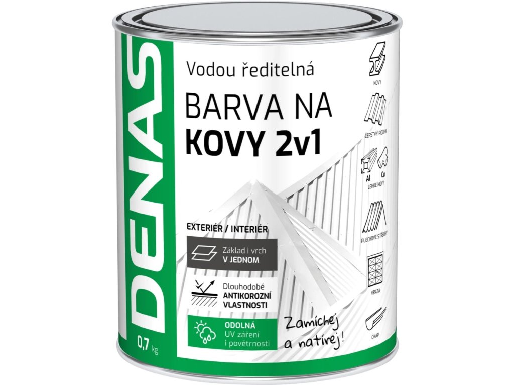 DENAS KOVY 2v1 je samozákladující, polomatná, antikorozní, vodou ředitelná barva určená k ochraně