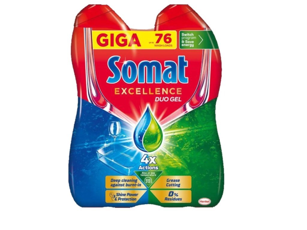 Značka Somat se rovněž zasazuje o čistší svět: láhev tekutého prostředku na mytí nádobí je vyrobena z 50 % recyklovaného plastu a po odstranění plastové fólie ji lze opět recyklovat. Náš závod navíc pracuje se 100% obnovitelnou elektřinou a z naší výroby se nevyváží žádný odpad na skládky. Somat Excellence Duo Gel je speciálně vyvinut pro krátké a eco programy s nízkou teplotou. Přepněte program a ušetřete vodu a až 20 % energie se Somatem!