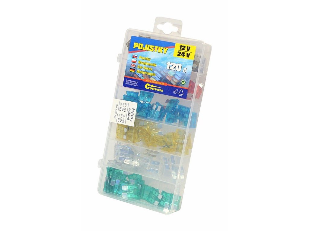 Praktické uzavíratelné balení automobilových nožových pojistek.Celkem 120 pojistek v přehledném, přihrádkami opatřeném kufříku. Pojistky jsou určeny pro napětí do 50 V a jsou certifikovány, materiál zinek v kombinaci s plastem.