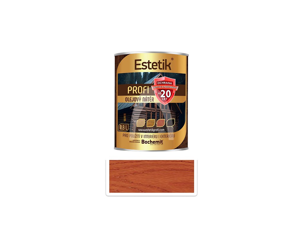 Estetik Profi je určen k nátěrům dřevěných staveb a ostatních venkovních dřevěných prvků (ploty, pergoly, zahradní nábytek, obložení, trámy apod.). Slouží k dlouhodobé ochraně dřeva před UV zářením a před pronikáním vody. Penetruje do struktury dřeva, zvýrazňuje jeho kresbu a dodává mu požadovaný odstín. Vytváří polo matné povrchy, které jsou snadno obnovitelné bez nutnosti odstraňování původního nátěru. Estetik Profi je olejový dlouholetý nátěr s životností nad 15 let určený k ochraně dřeva vystavenému vnějším povětrnostním vlivům. Tam kde je povrch vystaven většímu mechanickému namáhání (desky stolů, lavic, židlí) je doporučeno přetřít povrch jedním nátěrem produktu Estetik Finish Profi. Tím dojde k zvýšení odolnosti povrchu, který následně odolává mechanickému namáhání. Estetik Profi se nikdy neloupe ani nepraská. Snadno se po letech renovuje, pouhým přetřením po odstranění nečistot a prachu z povrchu. Není potřeba žádné odstraňování starého nátěru nebo broušení. Estetik Profi díky unikátnímu složení dobře odolává i těžkým atmosférickým podmínkám a po celou dobu zvýrazňuje kresbu dřeva. Životnost nátěru více než 15 let Nepraská a neloupe se Dlouholetá dokonalá ochrana před vlhkostí a UV zářením Použití v exteriéru i interiéru Penetruje hluboko do struktury dřeva Neomezuje dýchání dřeva Snadno se aplikuje - roztírá Stavební technické osvědčení STO-AO-224-1029/2020Doplňkové parametry