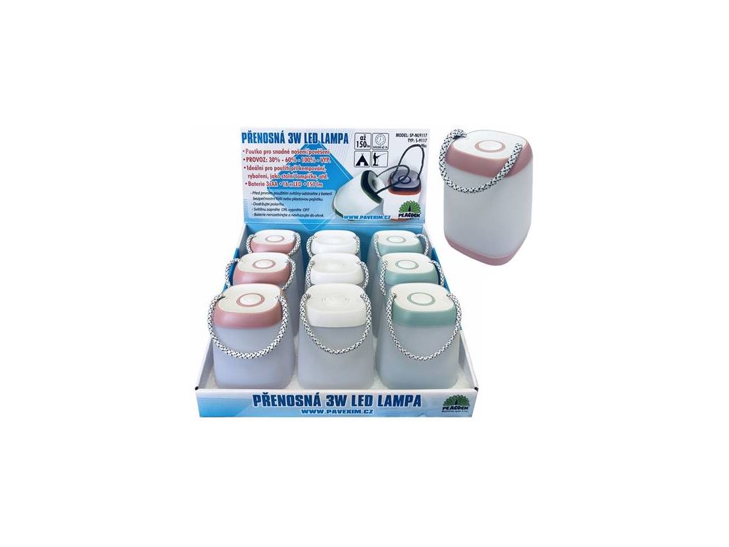 (BAL:1/9/27ks) 3W LED přenosná lampa, ideální pro použití při kempování, rybaření, jako stolní lampička. 150lm. Provozní režimy: 30% - 60% - 100%. . Poutko pro snadné nošení/pověšení. . Rozměr: 95x130x95mm. Svícení až 7hod. Napájení: 3xAA součástí balení. Barva: RŮŽOVÁ, BÍLÁ, ZELENÁ.